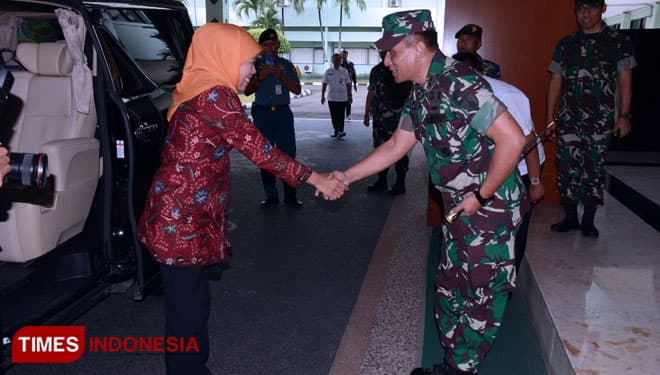 TIMES Halmahera/Pangdam V/Brawijaya, Mayjen TNI Wisnoe, P.B, menyambut kedatangan Gubernur Jatim, Khofifah Indar Parawansa di Makodam V/Brawijaya, Rabu (20/2/2019).(Foto: Istimewa)
